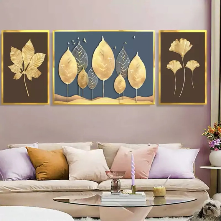 تابلو دکوراتیو لاکچری برگهای خشک پاییزی طلایی سه تیکه نامنظم