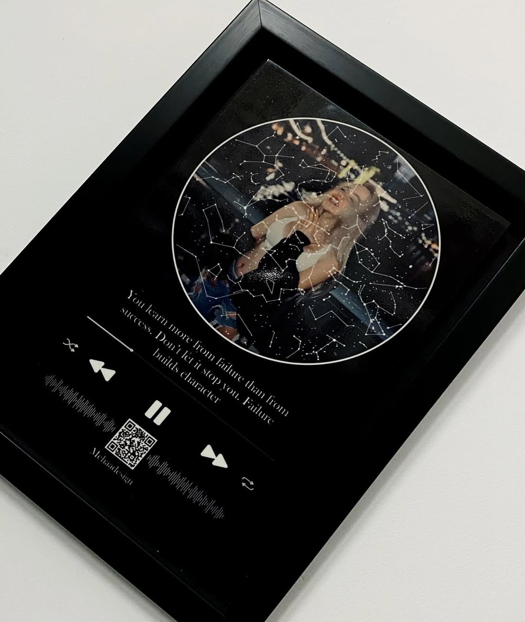 این کاشی با قاب معلق طراحی شده و ستاره ها مطابق با تاریخ مورد نظر شماست. متن و موزیک دلخواه شما روی کاشی قرار میگیرد.