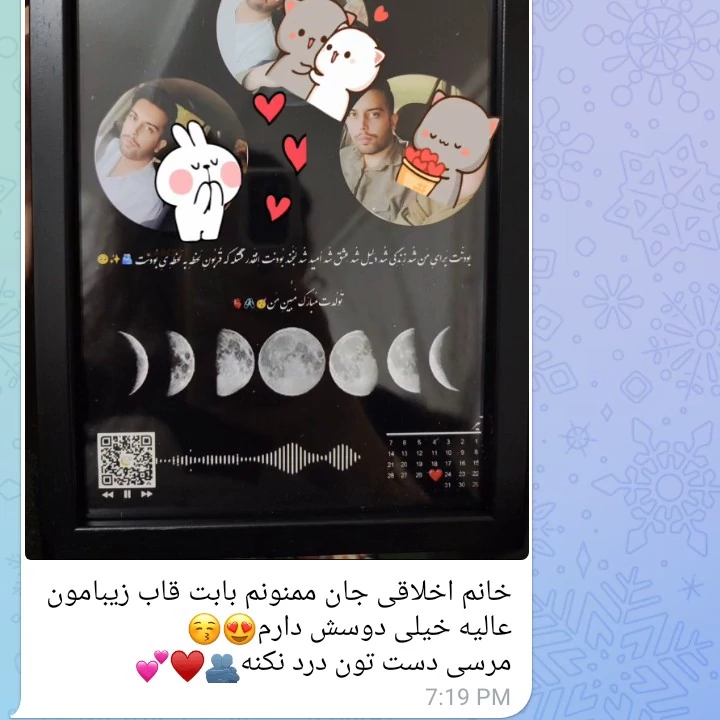 قاب موزیکال سفارشی طرح ماه و چهره 🌒 این قاب موزیکال جذاب رو از دست ندین و با موزیک دلخواه تون سفارش بدین ✨😍 ❌4روز آماده سازی میشه و بعد پست میکنیم طی 7 روز کاری بدست شما میرسه‼️ قبل از ثبت سفارش در چت باسلام پیام بدید