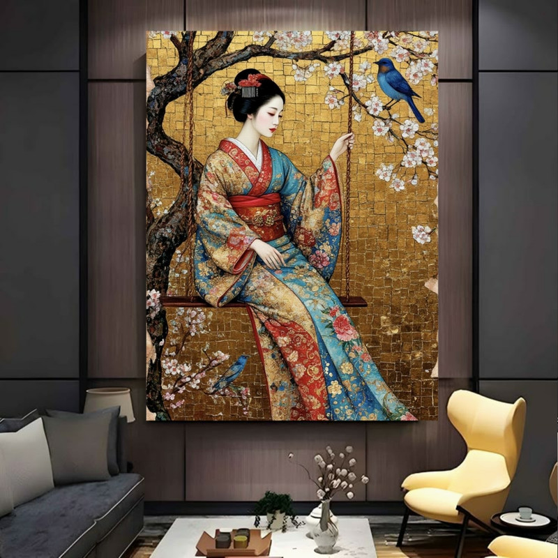 تابلو بوم طرح مخمل نقاشی بانوی ژاپنی مدل تاب و شکوفه کد BK24400