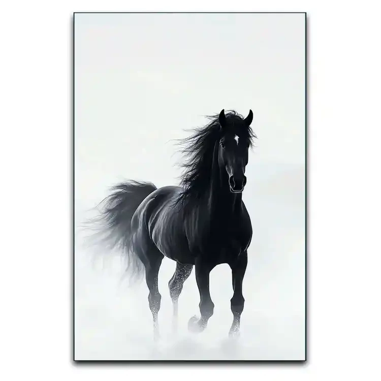 تابلو طرح اسب در مه، تصویری رویایی از شکوه و آرامش است. اسب، این نماد آزادی و نجابت، در فضایی پوشیده از مه و سفید مطلق، یادآور سکوت طبیعت و پاکی درون است.