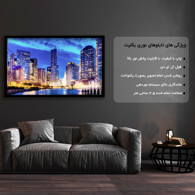 تابلو های نوری و به اصطلاح تابلو های پشت چراغ دار به تابلو هایی گفته می شود که تصویر آن توسط سیستم نوری که در پشت آن تعبیه شده است به صورت یکنواخت روشن می گردد؛که در این حالت جلوه ویژه ای به تصویر خواهد داد.از این نوع تابلو ها می توان در دکوراسیون داخلی منازل و فضاهای اداری و تبلیغاتی استفاده نمود.گروه تولیدی بکلیت به صورت تخصصی بر روی انواع تابلو های نوری متمرکز می باشد و در سایز های مختلف و با قاب های متنوع قادر به تولید این تابلو ها به صورت گسترده و با کیفیت عالی میباشد.تصویر این تابلو ها بر روی کاغذی چاپ می شود که قابلیت پخش نور بسیار زیادی را دارا می باشد و نور را در کل تابلو می گستراند.سیستم نوری این تابلو ها به صورت فول ال ای دی 220 ولتی می باشد که در پشت تمام تصویر نصب می گردند و با برق مستقیم شهری روشن می شوند.از این تابلو ها یک سیم برق 1.5 متری نیز دارد که شما می توانید آن را مستقیم به پریز وصل نمایید.ضخامت این تابلو ها 4.5 سانتیمتر می باشد و نمای کناری این تابلو یک فریم pvc با عمق 4.5 سانتیمتر می باشد.